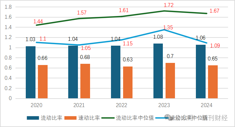 四川长虹还面临潜在的短期偿债压力,其流动性指标持续低于行业基准。近五年流动比率稳定在1.05左右,速动比率维持在0.66附近,2024年两项指标分别为1.06和0.65。与行业整体相比,四川长虹的流动比率为1.06,较行业中位值1.67低0.61,速动比率0.65较行业中位值1.09低0.44。该差异反映企业在资产流动性与短期债务覆盖能力方面较弱,需持续关注短期偿债能力变化。