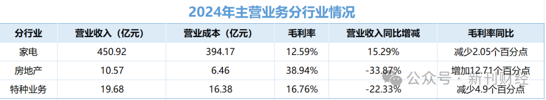 企业年报显示,从公司主营业务分行业情况来看,家电板块实现营业收入450.92亿元,占总营收43.49%,为第一大收入来源,但受海外地缘冲突、关税政策调整及行业竞争加剧影响,毛利率同比降低2.05个百分点至12.59%。同期房地产业务收入10.57亿元,同比下滑33.87%,企业表示这是“受收入确认周期性特征,且房地产市场持续下行影响”。鉴于当前房地产市场持续调整,该业务板块的业绩波动或对公司整体经营形成持续压力。另外,特种业务2024年实现营收19.68亿元,同比下降22.33%;毛利率同比下滑4.9个百分点至16.76%,也在一定程度上拖累了公司的整体盈利。