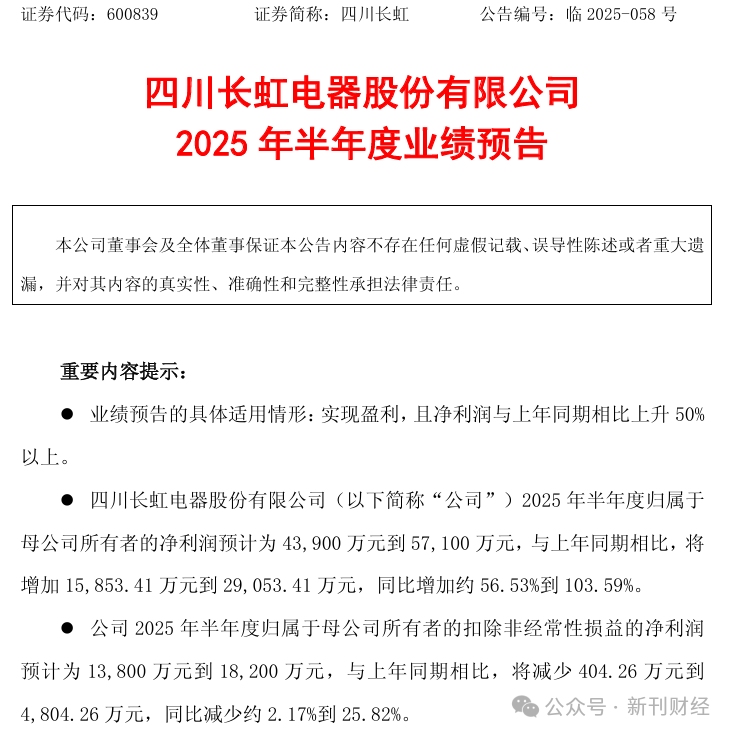 2025年7月18日,四川长虹电器股份有限公司(600839.SH,以下简称“四川长虹”)牵头筹建并运营的四川省具身智能机器人训练场在绵阳正式授牌成立,成为西部首个省级具身智能机器人训练场。而在一周前发布的半年度业绩预告显示,公司2025年半年度归母净利润预计为4.39亿元到5.71亿元,同比增加约56.53%到103.59%。扣非净利润预计为1.38亿元到1.82亿元,同比减少约2.17%到25.82%,出现近年来少见的下滑。
