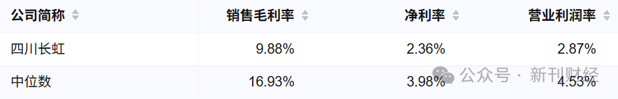 四川长虹的盈利效率显著弱于行业平均水平。数据显示,2025年一季度企业销售毛利率较行业中位值16.93%低7.05个百分点;净利率为2.36%,低于3.98%的行业中位值1.62个百分点;营业利润率2.87%与行业中位数差距达1.66个百分点。三项核心盈利指标全面低于行业中位值,反映公司整体盈利能力存在系统性不足,成本管控与运营效率亟待优化。