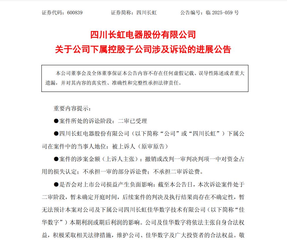 四川长虹表示,截至公告日,此次诉讼案件处于二审阶段,开庭时间尚未确定。后续案件的判决及执行结果存在不确定性,暂时无法预估对公司及下属公司佳华数字本期利润或期后利润的影响。四川长虹及佳华数字将依法维护自身合法权益,积极采取法律措施。