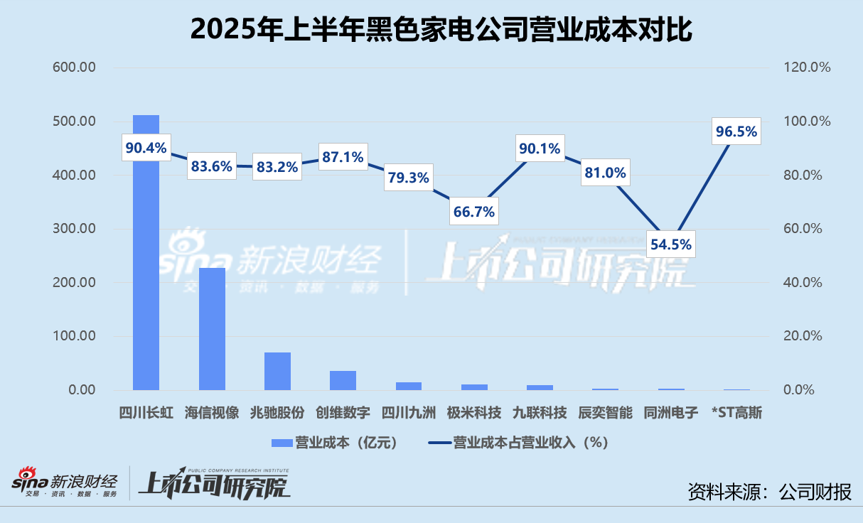 就收入规模而言,四川长虹以567.05亿元位居榜首,约为第二名海信视像上半年营收的2.08倍,而其他黑色家电品类第一名创维电子收入仅为40.95亿元。*ST高斯2025年前6个月仅实现9837.09万元营收,在10家公司中垫底。同洲电子收入同比增速达606.5%,业绩公告显示,其新增的高功率电源业务报告期内收入激增961.4%,是驱动业绩向好的关键。九联科技收入较2024年同期下降17.6%,公司解释称是供货的中国移动集采项目智能网络机顶盒中标单价下降、出货需求减缓所致。