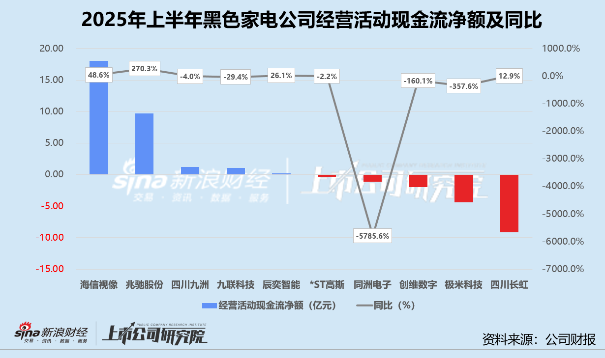 就盈利质量而言,报告期内兆驰股份经营性现金流转正,*ST高斯、同洲电子、创维数字、极米科技和四川长虹经营活动产生现金净流出,约60%的公司经营活动现金流净额同比减少。海信视像的经营性现金流最为充足,同比增长48.6%至18.02亿元。四川长虹尽管营收拔得头筹,但经营活动产生现金净流出高达9.13亿元,应收账款同比增长15.6%。同洲电子经营活动现金流由2024年同期的203万元净流入转为净流出1.15亿元,降幅远超其他公司,其应收账款同比激增209.7%。