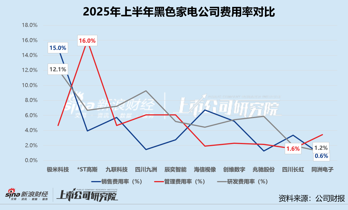 就费用效率而言,辰奕智能和海信视像销售费用、管理费用和研发费用全面增长,*ST高斯、九联科技、四川九洲、创维数字和同洲电子销售费用和研发费用双降。极米科技的销售费用率最高,约为15.0%。海信视像和辰奕智能是唯二销售费用增长的公司,涨幅分别为14.1%、13.2%,尤其海信视像的市场推广费用同比提高64.6%。同洲电子销售费用较2024年同期骤降30.3%,规模不足350万元。