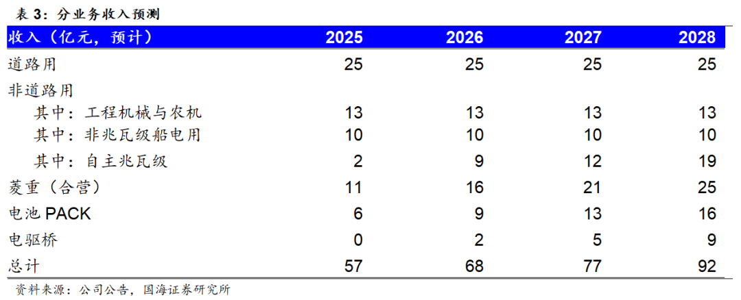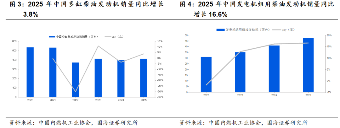 我们预计,AIDC电源带动的发动机需求有望在未来数年持续释放。公司在该领域已完成产品与产能布局,具备率先受益条件。一方面,菱重发动机具备成熟产品与客户基础,2026 年在下游需求增长及产能利用率提升的背景下,销量有望持续提升;另一方面,并表上柴动力的VK16 等产品有望进入放量阶段,预计2026 年销量爬坡至500台。考虑该类产品单台价值量及盈利能力显著高于传统道路用、非道路用发动机,AIDC电源用发动机业务在收入和利润端的贡献占比有望持续提升,成为公司中期业绩增长的核心驱动之一。