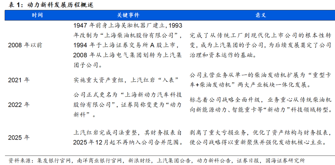 1993年,企业改制为“上海柴油机股份有限公司”,并于次年在A股上市。2008年划归上汽集团后,公司战略定位转变为服务集团商用车板块的核心动力总成商。2021年,重大资产重组将上汽红岩纳入麾下,公司业务扩展至“整车+发动机”。2022年,公司更名为“上海新动力汽车科技股份有限公司”,彰显向新能源、智能化等“新动力”领域全面战略转型的决心。2025年12月,公司完成对上汽红岩的出表,合并报表质量得以显著改善,并将重新聚焦发动机核心主业。
