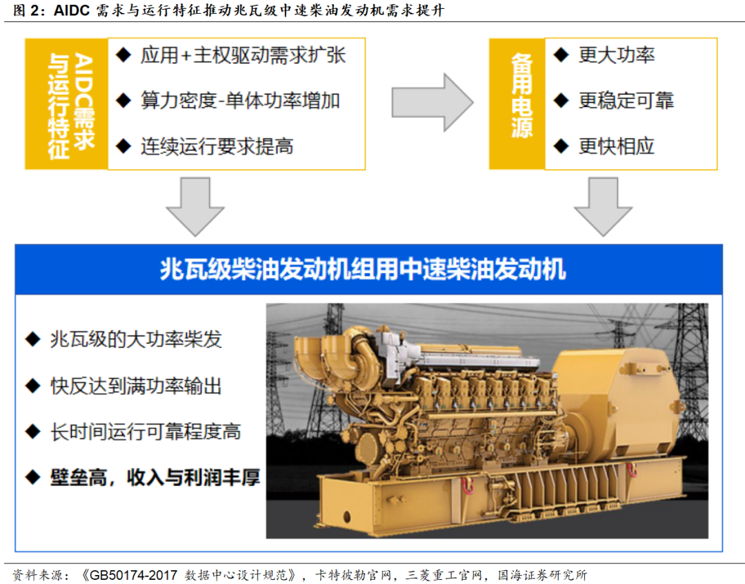 AIDC 建设扩张带动高可靠备用电源需求上升。随着人工智能训练及推理算力需求快速增长,AIDC(AI 数据中心)在单机柜功率密度、整体用电规模及连续运行要求均高于传统DC。根据《GB50174-2017 数据中心设计规范》,高等级数据中心需配置独立于市电的备用电源体系,以在电网故障或异常情况下维持负载的连续运行。工程实践中,在长时间市电中断场景下,需由备用发电系统持续供电。因此,我们认为,随着AIDC 建设规模扩大及单体功率提升,备用电源配置规模及可靠性要求同步提升,有望推动备用发电系统需求持续增长。