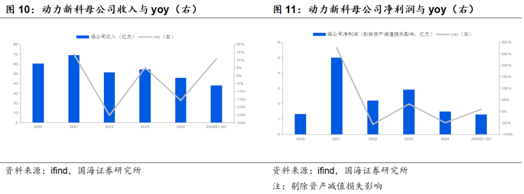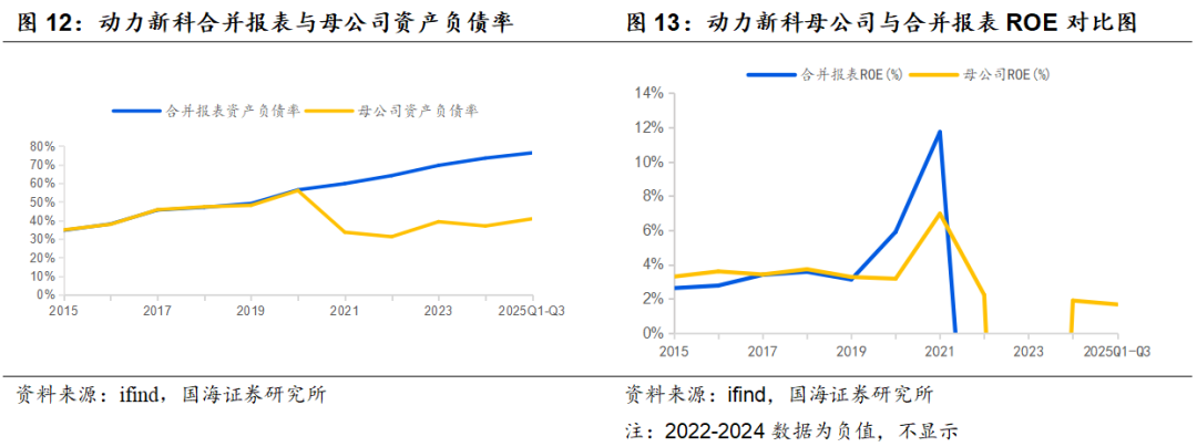 上汽红岩出表后,合并报表质量有望显著改善。一次性影响以外,合并报表有望回归母公司更稳定的盈利能力,资产负债率及有息负债水平也有望显著下降。动力新科母公司主业以柴油发动机为主,收入与利润稳定性更强。2022年至2025年前三季度,母公司净利润(剔除资产减值损失影响)稳定在1-2亿元,截至2025年第三季度末,公司拥有货币资金40.81亿元,母公司净资产65.9亿元,两倍于合并报表净资产,且母公司无有息负债(短期借款或长期借款)。上汽红岩出表后,公司合并资产负债率较此前大幅下降,母公司ROE呈现向上拐点,已逐步靠拢合理区间。