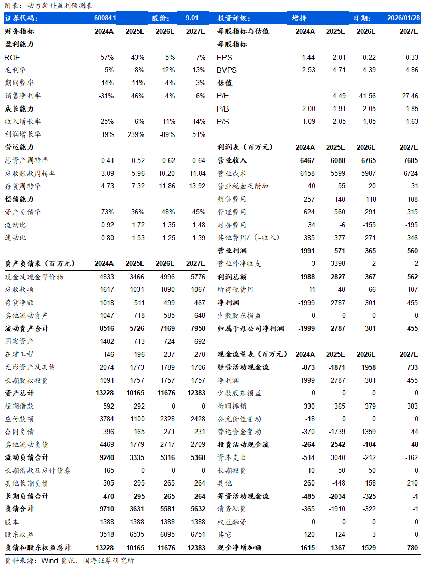 1.新科动力具备AIDC电源用发动机能力,相关业务有望带动公司快速增长;2.上汽红岩出表,公司财务表现预计有显著改善;3.新领导层上任,“十五五”目标双倍增,公司有望向社会资源战略进一步转向,并优化提升产品结构与经营效率。鉴于上汽红岩2025年出表带来一次性影响,我们预计公司2025-2027年实现营业收入60.9、67.7、76.9亿元,同比增速-6%、+11%、+14%;实现归母净利润27.9、3.0、4.6亿元,同比增速+239%、-89%、+51%。EPS分别为2.01、0.22、0.33元,2025-2027年归母净利润对应当前股价的PE估值分别为4.5、41.6、27.5倍,首次覆盖,给予“增持”评级。