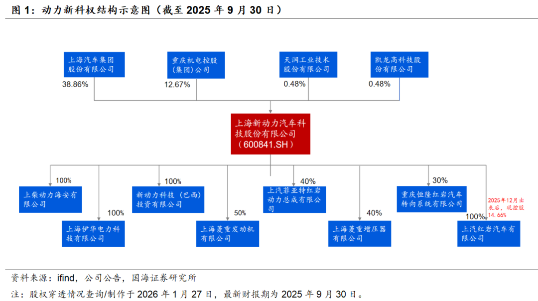 公司核心业务是内燃发动机,并正积极向新能源电驱动系统领域拓展。截至2025年9月30日,公司控股股东为上海汽车集团(持股38.86%)。重要股东包括重庆机电(间接持股12.67%)等。公司主要子公司包括100%控股的上柴动力海安、上海伊华电力科技,以及合、联营的上海菱重发动机(持股50%)、上汽菲亚特红岩动力总成(持股40%)等。公司原全资子公司上汽红岩汽车已于2025年12月完成重整,不再纳入合并报表,持股比例降至14.66%。