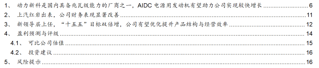 风险提示 1)AIDC 行业需求不及预期风险。2)社会化配套转型不及预期风险。3)动力电池、电驱桥等新业务拓展风险。4)兆瓦级发动机、海外市场等行业竞争加剧风险。5)柴油发动机行业周期、原材料价格波动等导致财务指标波动风险。6)国际化布局相关政策、汇率、竞争等风险。