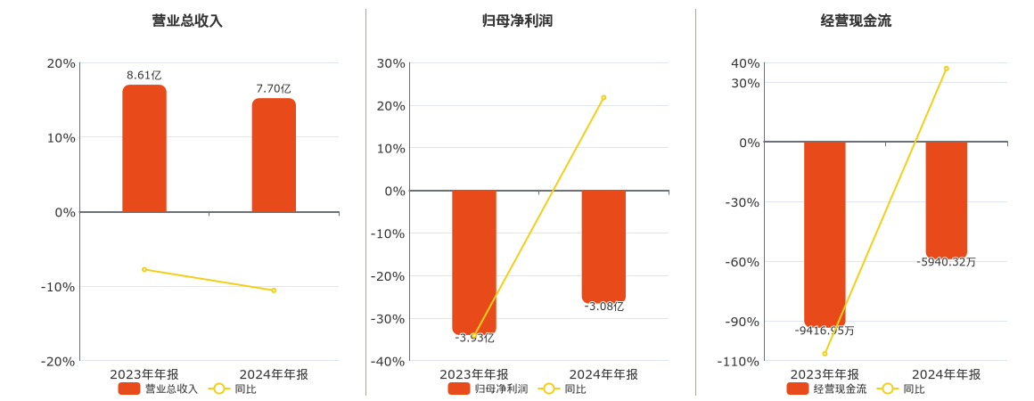 公司营业总收入为7.70亿元,较去年同报告期营业总收入减少9115.78万元,同比较去年同期下降10.59%。归母净利润为-3.08亿元。经营活动现金净流入为-5940.32万元。