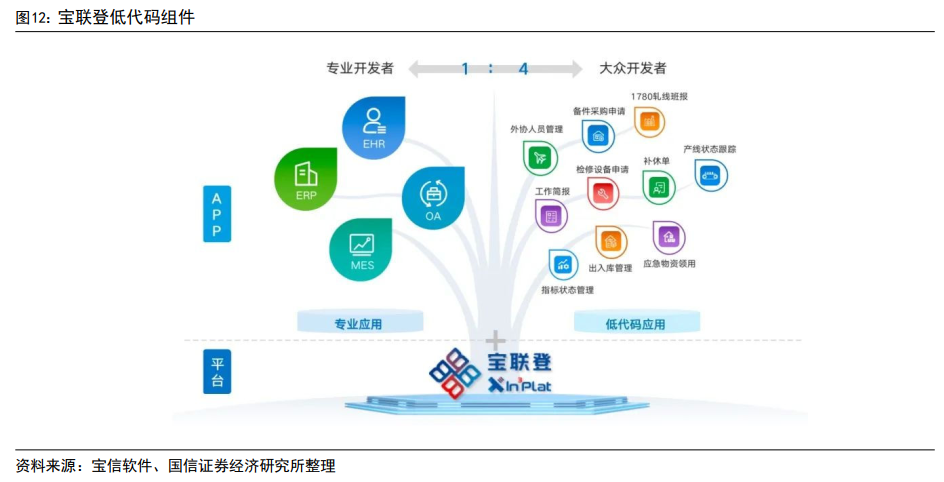 以公司低代码平台为例,公司通过应用可视化、页面视图可视化、数据可视化、流程可视化、自动化动作、系统权限自主可控6大能力,降低开发门槛,只需5个步骤即可快速搭建应用。宝联登低代码组件面向专业系统未涉及的末梢需求,例如集团意外险填报,通过低代码组件实现即搭即用,最终快速完成100多家分子公司的意外险数据填报和汇总,实现流程线上化,配置线上化等。