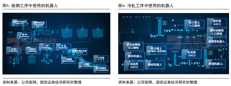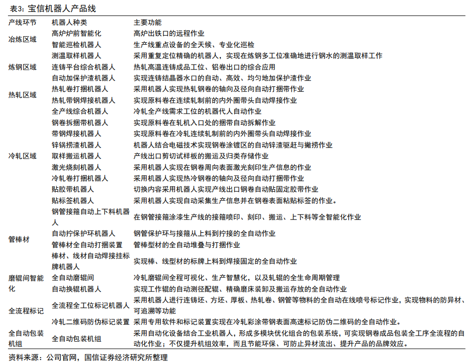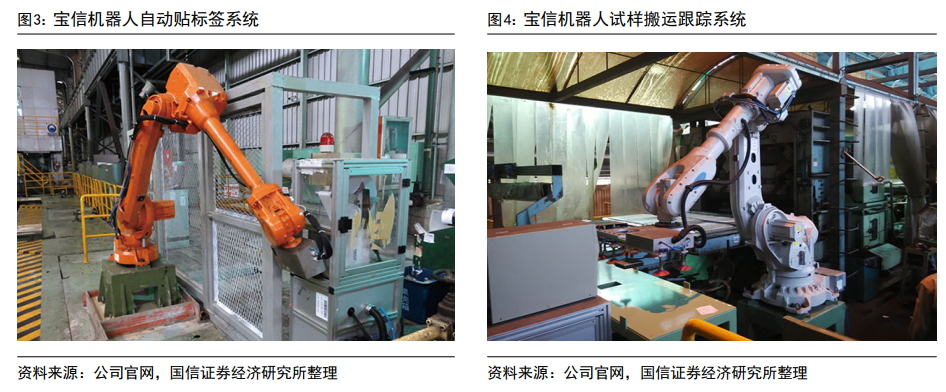 宝信智能装备已具备丰富的机器人解决方案。公司智能装备事业部致力于提供智慧制造全流程的技术、产品和解决方案,帮助制造企业推进无人化和少人化、优化生产和物流效率等,包括智能产线、智慧物流、智能检测、智慧质量。其中智能产线以机器人为核心,覆盖从冶炼、炼钢到热轧、冷轧、自动化流程等八个领域,公司提供各类工业机器人设备、解决方案、全生命周期运维,在钢铁行业全流程中实现生产线少人化、无人化。同时,公司也持续提供非钢行业机器人应用及整体解决方案。