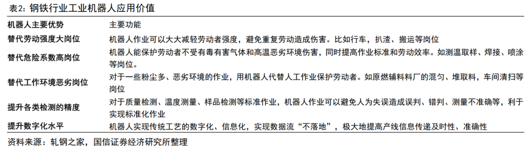 钢铁行业机器人应用有望加快。近年来在宝武集团和宝信软件引领下,钢铁行业数字化水平持续提升,但钢铁生产过程中资源消耗、能耗依然过大,工艺技术与装备缺乏自主创新问题依然存在。钢铁行业低端产能过剩、高端供给不足、质量控制能力不足都对自动化、智能化水平提出了新的要求。借助物联网传感技术,实现信息化融合,以机器人自动化实现对生产环节的逐步替代,是钢铁行业产业升级的关键措施之一,尤其是机器人对于劳动强度大、危险性高、环境恶劣的工种的替代。在此背景下,宝武集团提出“万台宝罗”上岗计划,机器人在钢铁行业有望快速应用。