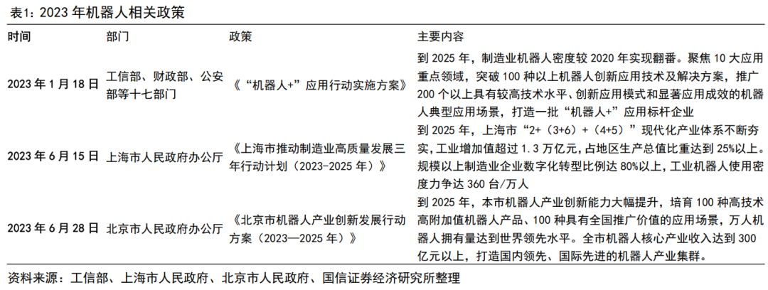 机器人产业再迎利好,行业发展有望加速。随着我国人口老龄化趋势持续,生产一线招工愈发困难;而制造业升级对工艺技术精细化、工业软件、智能化也提出了更高要求,机器人产业在供需两端的发展均迫在眉睫。23年1月,《“机器人+”应用行动实施方案》发布,要求制造业机器人密度较2020年实现翻番,加强典型场景的覆盖和突破。23年6月,《上海市推动制造业高质量发展三年行动计划(2023-2025年)》、《北京市机器人产业创新发展行动方案(2023—2025年)》相继发布,一线城市制造业对机器人应用进一步加强;上海明确提出2025年工业机器人使用密度力争达360台/万人,北京要求万人机器人拥有量达到世界领先水平,全市机器人核心产业收入达到300亿元以上。各方面政策也均提出了加强“人形机器人”的布局和突破,未来机器人产业从工业级走向消费级,产业空间持续打开。