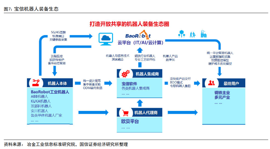 2026年宝武将有万台“宝罗”机器人服役,推动宝信机器人业务快速增长。2022年6月,宝武集团召开万名宝罗上岗实施动员大会,宝罗云平台暨“宝罗之家”正式启用。随着我国制造业的发展,机器人替代人工是大势所趋,目前宝武计划陆续将有超1万台套“宝罗”机器人上岗,完成在制造业单元的应上尽上。宝信软件在机器人领域持续投入,以“极致效率、极致成本、标准交付”为目标,以点带面实现引领。所有宝罗都将接入公司打造的“宝罗”云平台,并达到“统一标准、统一品牌、统一接入、统一服务”的四大要求;通过云平台,机器人可以实现OTA在线升级,经验积累可以同步给其他机器人。公司积极探索 RaaS(Robot as a Service)服务模式,2022年8月,马钢首批40名宝罗员工正式上岗。该业务以宝信云平台为基础,采用BOO的商业模式、平台化运营及RaaS服务,快速推进宝罗机器人上岗。机器人应用将形成广泛客户粘性,BOO模式有助于公司取得长期稳定的持续收入。