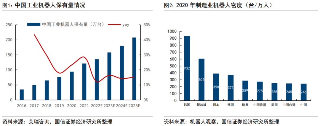 我国机器人市场持续增长,密度有望加快提升。2023年我国工业机器人保有量将突破150万台,预计未来三年将保持稳定增长。目前,我国已经成为世界最大的工业机器人市场之一,2023年随着机器人相关政策陆续出台,将进一步推动我国机器人市场快速发展。目前,我国机器人密度提升较快,从2015年49台/万人,增长至246台/万人;但是与韩国932台/万人,新加坡605台/万人,日本390台/万人相比,还是有较大的提升空间。