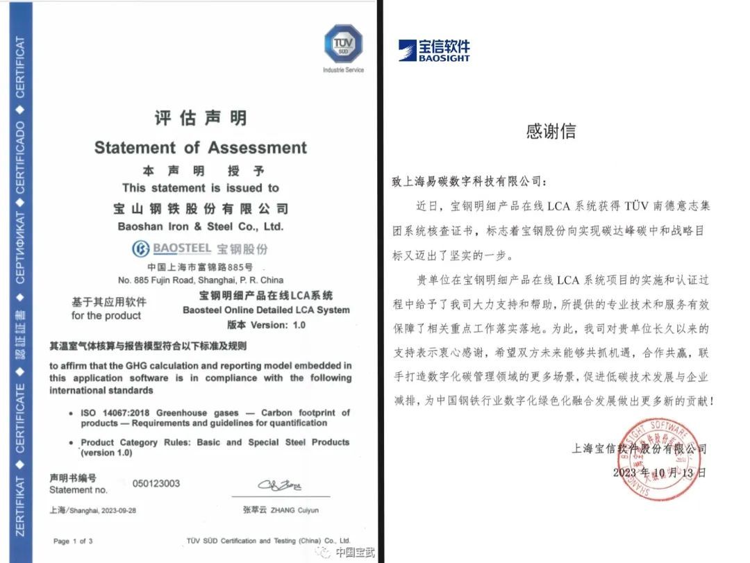 近日,易碳数科联合宝信软件共同支撑的“宝钢明细产品在线LCA系统”项目,获得国际权威第三方检测、认证机构TüV南德意志集团(以下简称“TüV南德”)颁发的评估声明。该评估声明证明了宝钢明细产品在线LCA系统的产品碳足迹计算与分析应用具备专业性和准确性。这是全球首个可以实现大规模实时碳量化核算及碳标签管理的系统。数字化技术驱动的精益碳管理已成为企业进行低碳转型和打造全球市场绿色低碳竞争力的必然趋势,此次国际权威认证为钢铁行业的率先应用提供了专业验证。