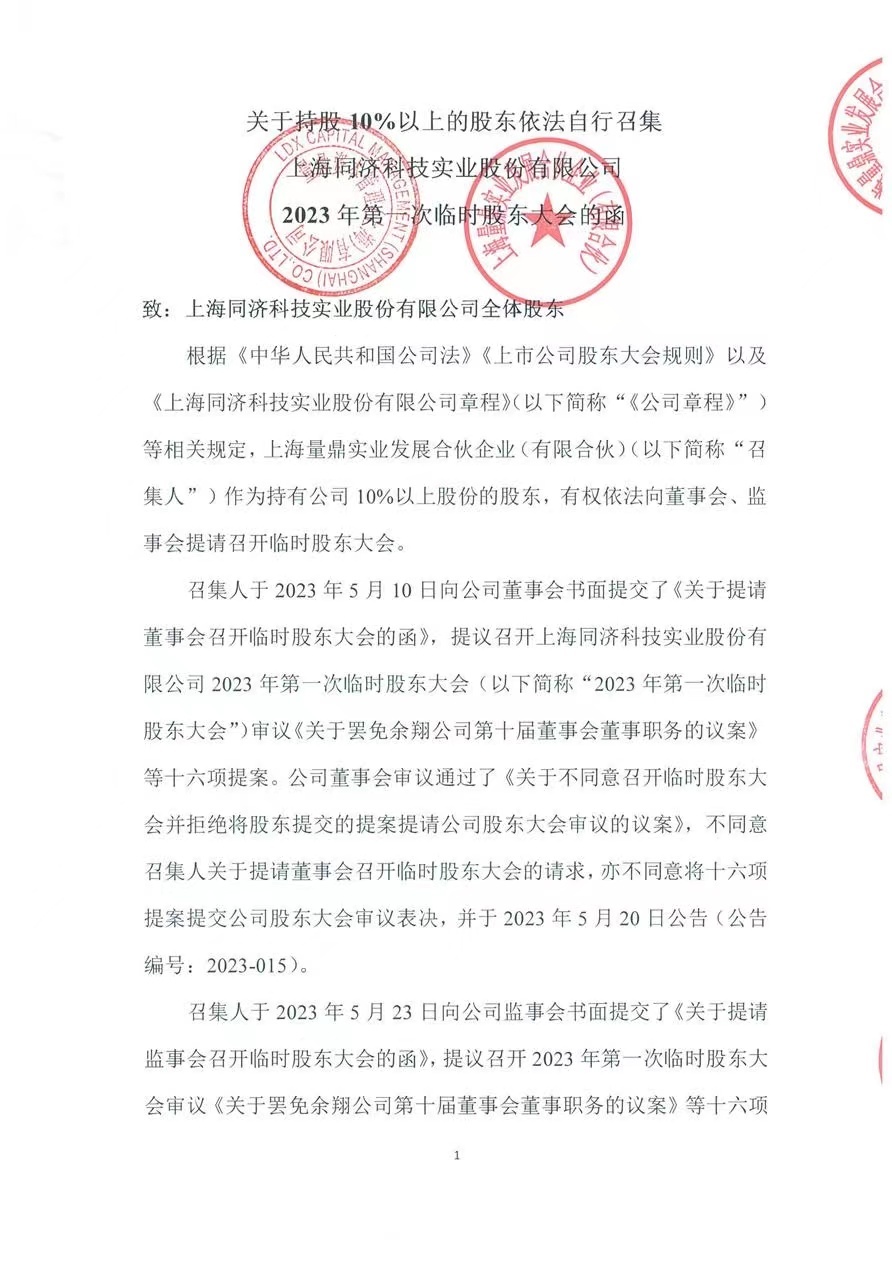 不过,同济科技董事会不同意召开临时股东大会。随后,量鼎实业于5月23日向监事会提议召开2023年第一次临时股东大会,审议上述16项提案。同济科技监事会同样未能同意量鼎实业召开临时股东大会的请求。