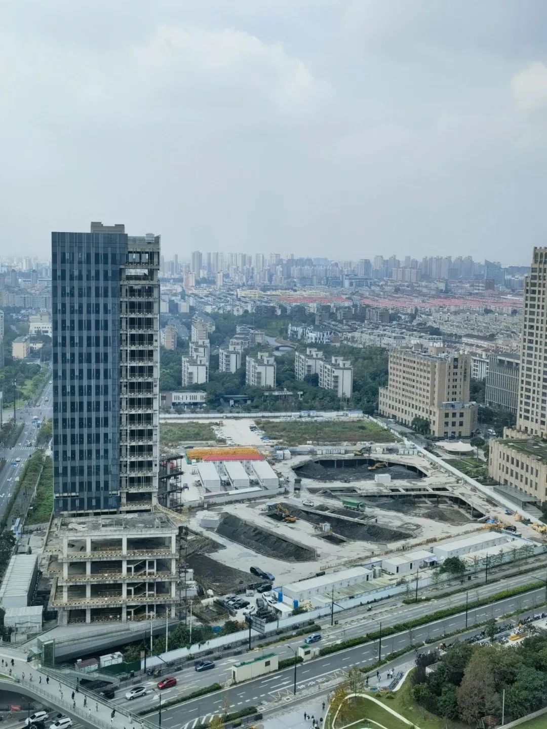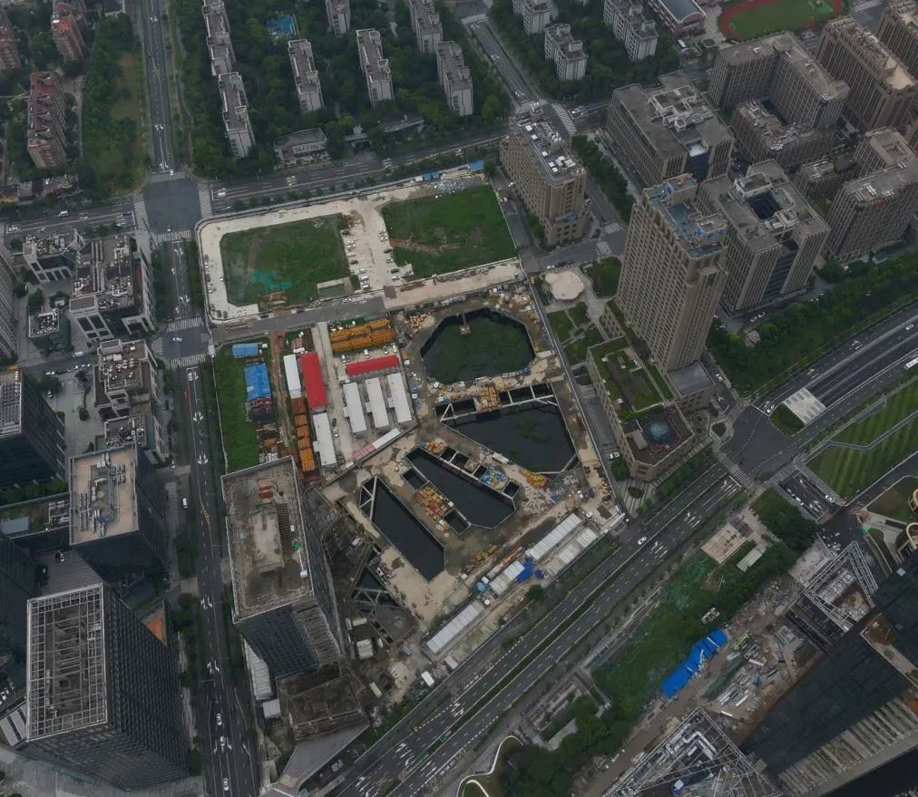 项目于2017年1月开始施工,因资金问题于2021年10月停工至今,截至停工时,项目南侧的写字楼及局部商业裙楼,主体结构已封顶,正处于外立面施工阶段;项目北侧的商业裙楼,已完成桩基、围护工程及二道支撑施工,仍处于地下施工阶段。