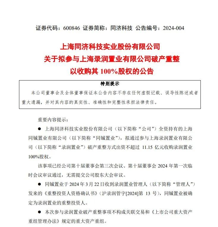 2024 年3 月21日,同济科技第十届董事会 2024 年第一次临时会议审议通过了《关于制定重整投资方案以收购上海录润置业有限公司 100%股权的议案》,同意同铖置业提交的重整投资方案,同意同铖置业通过破产重整方式,出资不超过11.15亿元,收购录润置业100%股权。