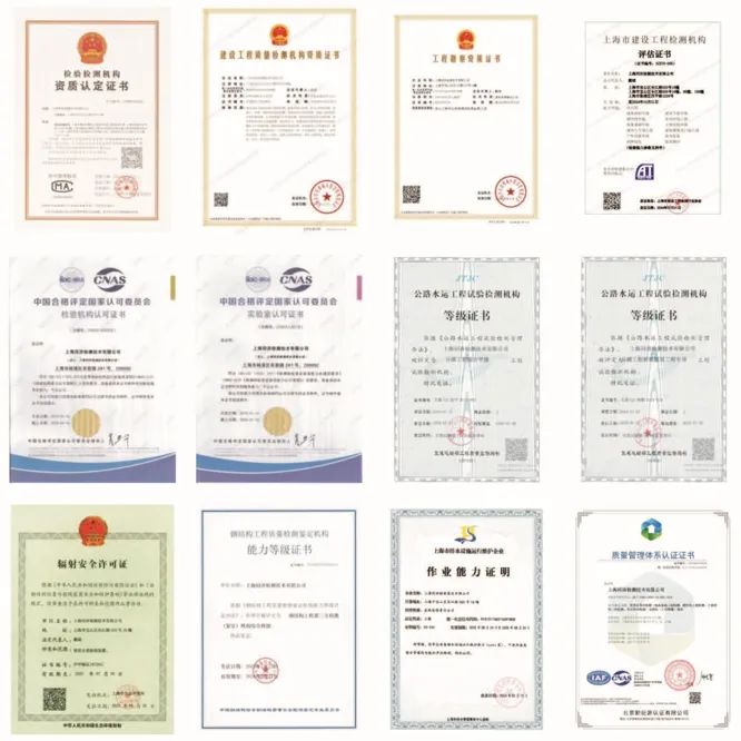 同济检测拥有交通部公路工程综合甲级、公路工程桥梁隧道工程专项检测资质;钢结构工程检测、见证取样检测、主体结构工程检测、地基基础工程、地下管线探测检测资质;测绘甲级以及建筑节能、室内环境、能效测评、套内质量、通风与空调、建筑工程沉降监测、消防安全评估等资质,并通过上海市质量技术监督局计量认证资质认定和ISO9001、ISO14001、ISO45001、ISO27001以及知识产权管理体系认证