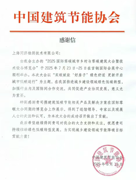 同济检测凭借其在建筑碳计量领域的专业积累与实践成果,荣幸成为首批会员单位,并在同期举办的“2025国际零碳城市乡村与零碳建筑大会暨技术设备博览会”(简称“国际零碳大会”)上,通过丰富的业务展示,全面呈现了在碳计量与核算领域的技术实力与实践案例,吸引了巡馆领导、专家及众多参展人士的驻足交流,赢得了广泛关注与高度认可。中国建筑节能协会特别发来感谢信,对同济检测的积极交流与贡献表示感谢。
