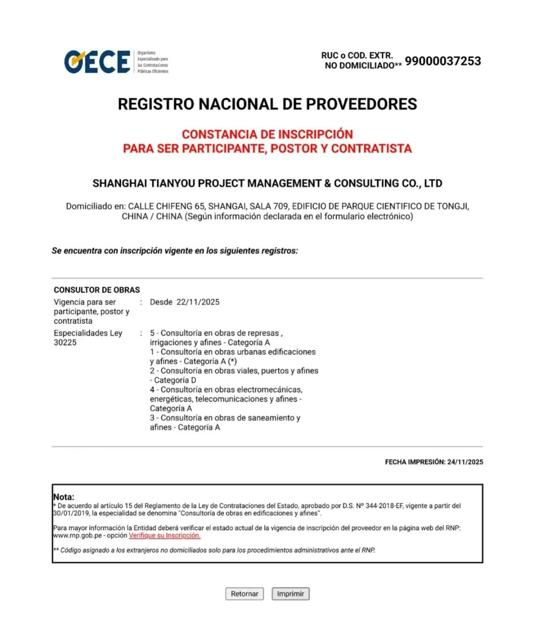 值得一提的是,依托扎实的项目业绩与稳健的财务表现,天佑咨询仅用三个月就顺利拿下该资质认证,远高于同类企业审批周期。获得当地相关部门如此高效的进程审批,凸显了秘鲁官方对天佑咨询专业技术能力、合规运营水平及行业服务经验等综合实力的充分认可。