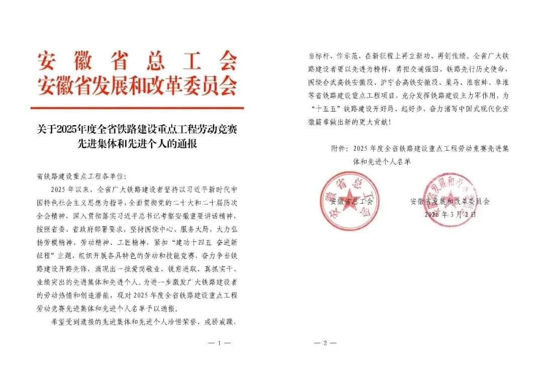 在安徽省2025年度铁路建设重点工程劳动竞赛中,天佑咨询合武高铁安徽段引入合肥枢纽监理项目部荣获“优秀监理项目部”称号,苏醒获评“省级铁路建设重点工程安全质量标兵”,李玉景获评“省级铁路建设重点工程巾帼标兵”。