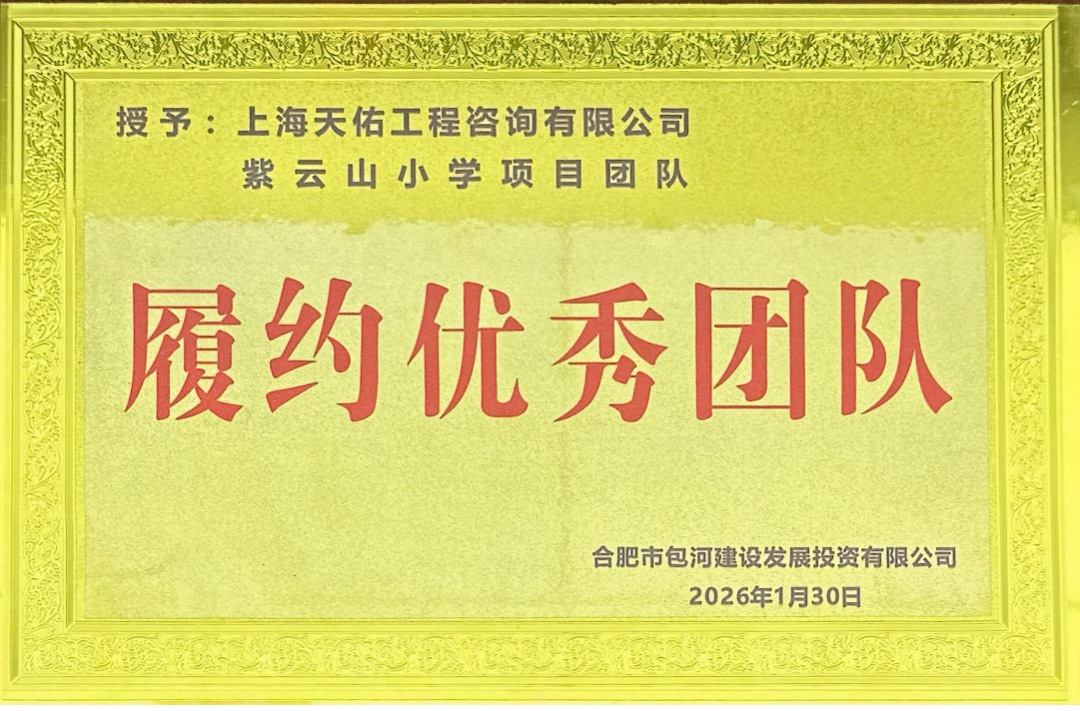 在合肥市包河建设发展投资有限公司2025年度参建单位表彰中,天佑咨询紫云山小学项目监理团队获评“履约优秀团队”,成为合肥市政教育工程监理的优秀代表。