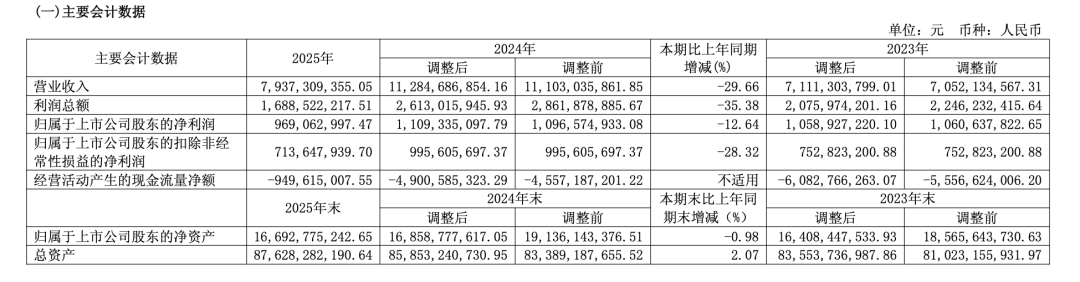 4月14日,上海临港控股股份有限公司(下称“上海临港”或“公司”,股票代码600848.SH、900928.SH)公布2025年年度报告。2025年上海临港实现营业收入79.37亿元,同比下降29.66%;归母净利润9.69亿元,同比下降12.64%;扣非后归母净利润7.14亿元。