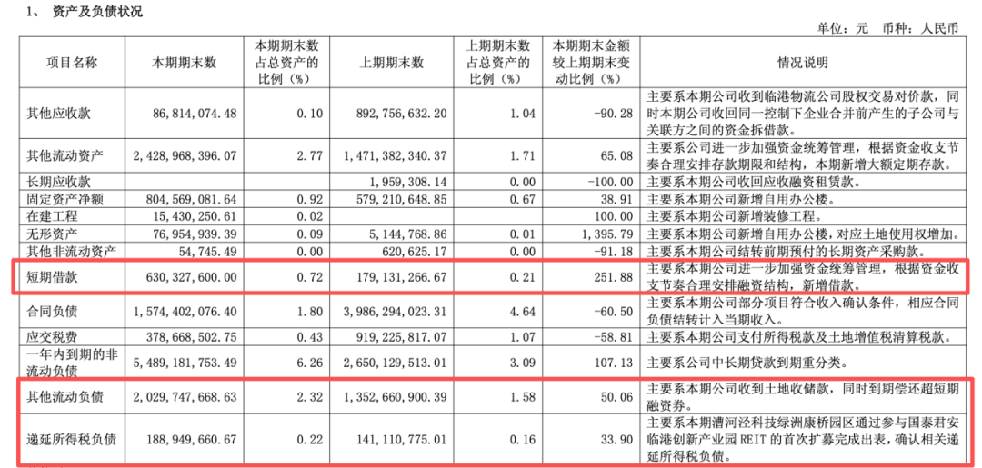 负债方面,2025年上海临港总负债586.74亿元,同比增长3.63%;有息债务为382.09亿元,同比增长1.03%;资产负债率为66.96%。年报披露,当期公司短期借款增幅达251.88%、其他流动负债增幅达50.06%、递延所得税负债增幅达33.90%。