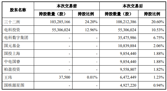 本次交易完成后,上市公司股本将增加至525,396,630股,三十二所持股比例为20.60%,仍为上市公司控股股东。中国电科控制的企业及其控制的企业管理的基金合计持有上市公司股份比例为41.81%,中国电科仍为上市公司实际控制人。本次交易不会导致上市公司实际控制人发生变更。