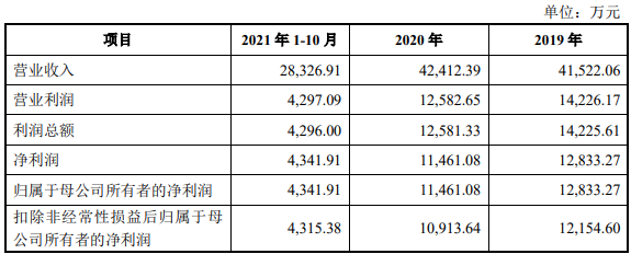 2019年、2020年及2021年1-10月,柏飞电子实现的营业收入分别为41,522.06万元、42,412.39万元、28,326.91万元,归属于母公司所有者的净利润分别为12,833.27万元、11,461.08万元、4,341.91万元,扣除非经常性损益后归属于母公司所有者的净利润分别为12,154.60万元、10,913.64万元、4,315.38,经营活动产生的现金流量净额分别为5,163.96万元、5,815.53万元、-5,968.07万元。