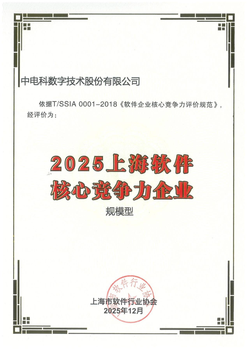 为树立上海软件企业品牌形象,加强软件企业竞争力宣传力度,促进软件产业高质量发展,上海市软件行业协会依据《软件企业核心竞争力评价规范》(T/SSIA 0001-2018),以行业统计数据为基准,开展了“2025年软件企业核心竞争力评价活动”,并正式对外发布了评选结果。中电科数字技术股份有限公司凭借在经营规模、经营能力、市场占有、研发投入、人才梯队及社会责任等综合领先优势,再度脱颖而出,连续五年获评“上海软件核心竞争力企业(规模型)”荣誉称号。