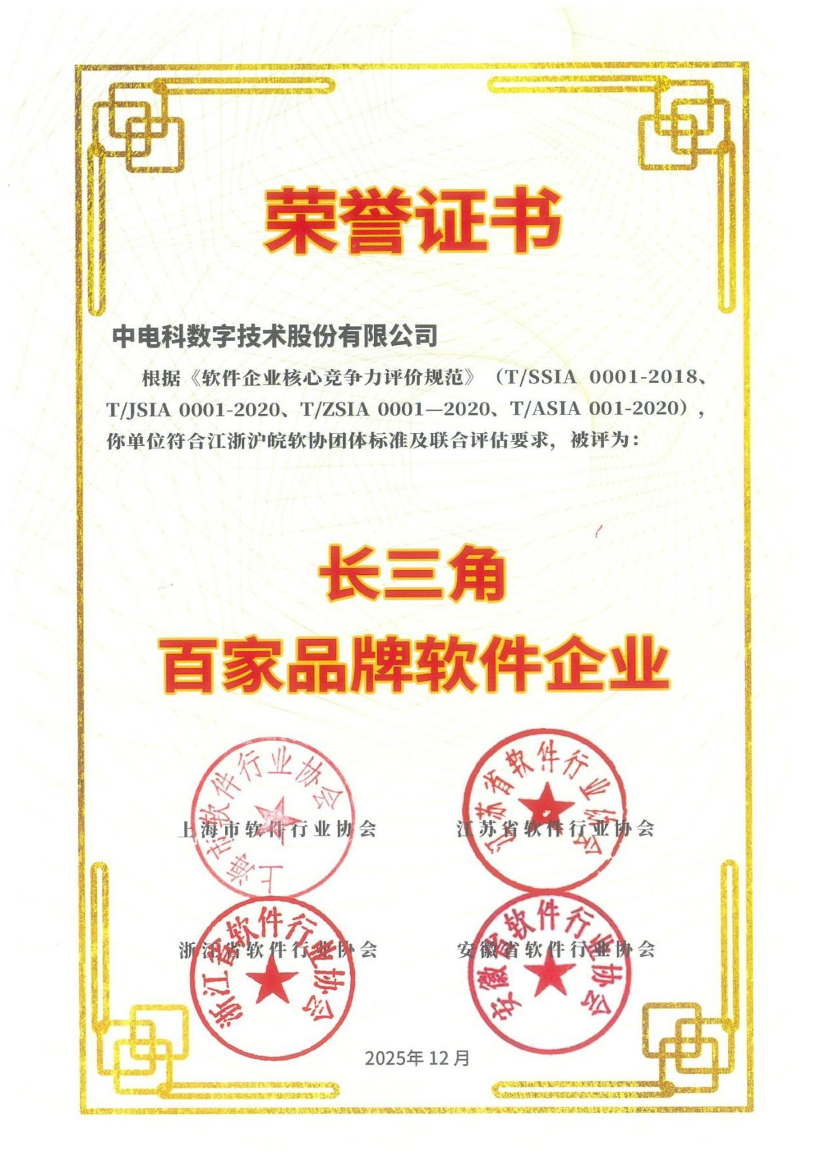 为贯彻落实习近平总书记长三角一体化发展战略,切实推动长三角区域一体化发展国家战略的落地,共同打造长三角区域软件品牌,沪苏浙晥软协按照统一标准,在各地开展“软件企业核心竞争力评价”活动的基础上,共同遴选推荐了“2025长三角百家品牌软件企业”。中电科数字技术股份有限公司凭借在客户、区域、技术、服务、管理、创新等方面的综合实力再次荣耀登榜,充分彰显了公司在数字化产品、行业数字化、数字新基建等核心赛道上的持续领跑优势。