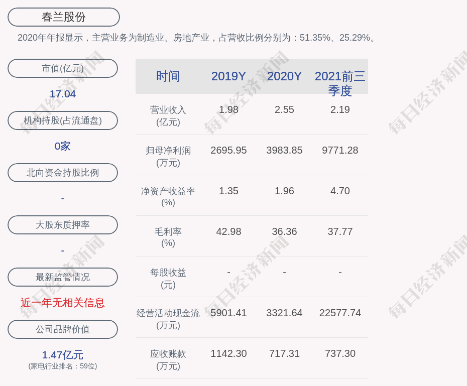 2020年年报显示,春兰股份的主营业务为制造业、房地产业,占营收比例分别为:51.35%、25.29%。