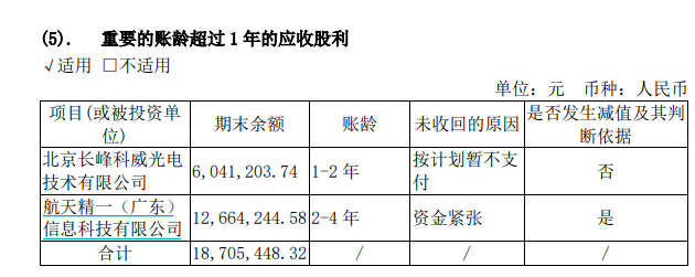 上市公司2021年年报中的应收股利附注显示,航天精一截至去年年末仍有1266.64万元股利未能支付。