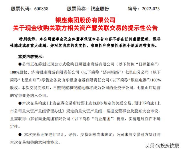 上个月已经开始传闻银座股份拟收购关联资产。昨晚,公司最终发布现金收购关联方相关资产的提示性公告。截至《投资快报》记者发稿,银座股份再度封上涨停板。