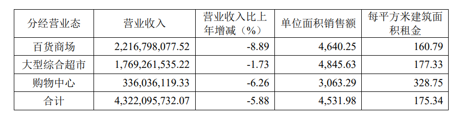 具体来看主营业务分经营业态情况,其中百货商场营业收入22.17亿元,大型综合超市营业收入17.69亿元,购物中心营业收入3.36亿元。各业务营业收入与去年同期相比均表现为下降。其中同比减少最多的是百货商场,同比减少8.89%