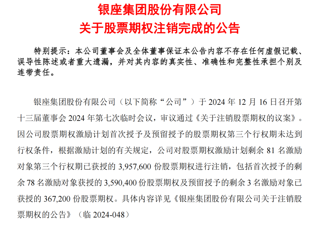 1月4日,银座股份发布公告称,公司将对股票期权激励计划剩余81名激励对象第三个行权期已获授的3,957,600份股票期权进行注销,包括首次授予的剩余78名激励对象获授的3,590,400份股票期权及预留授予的剩余3名激励对象已获授的367,200份股票期权。