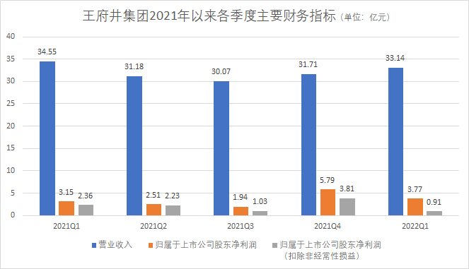截取2021年至今各季度财务表现来看,去年Q4业绩已经有了较大回升。年初王府井发布去年年报时,股价受业绩提振也有一定拉升。