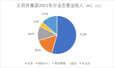 根据其2021年年报透露,王府井集团将会更加专注购物中心和奥莱业态的发展,百货业也将积极调整转型。目前,王府井旗下共运营有38家百货门店,14家奥莱门店,22家购物中心门店、15家合资超市、专业店等。