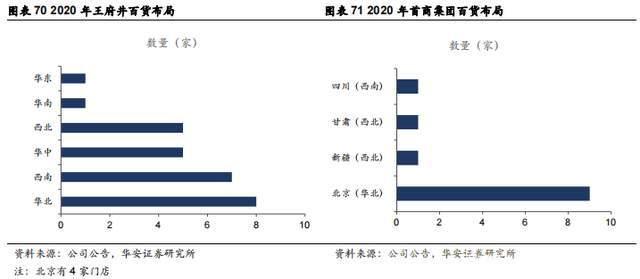 (2)规模:公司以大店为基础,以强店为支撑,以新店为补充进行规模扩张,截至2021年末,公司销售网络已经覆盖全国7大经济区域,35个城市,共运营74家连锁门店(其中自有门店28家,租赁门店46家;百货38家,购物中心22家,奥特莱斯14家),主要布局西北、西南和华北地区。