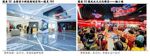 (3)打造沉浸体验空间,增加消费者黏性。和平大悦城通过打造沉浸式、体验感强的空间场景,增加与消费者的互动黏性:①公共空间:和平大悦城致力通过灯光、美陈等艺术装置打造逛街休憩空间,吸引消费者去探索有足够艺术氛围的公共空间打卡拍照,增强逛街体验。②主题街区:和平大悦城推出了全国首个科技智创空间—图灵101、集结天津食酒小滋味美食街—19铺、追求慢生活的匠心手作空间—超级工厂以及国风次元文化街区—鲤小巷,不仅通过主题街区的形式将场景体验、社交活动融为一体,而且将每个主题街区与特定圈层文化进行结合,如图灵101指向的是喜爱科技数码、智能化的青年客群,而鲤小巷则圈定了国潮、二次元、汉服等文化爱好者,通过共同兴趣、文化认同打动Z世代客群,打造多元文化输出的潮流新势能。
