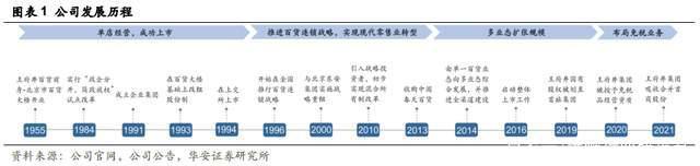 (1)1955~1995单店经营,成功上市。公司前身是由国家投资、建设的北京市百货大楼,创立于1955年,1991年成立了企业集团,1993年改组股份制。公司以北京百货大楼为主体,实施单店经营战略,并于1994年成功在上交所上市。