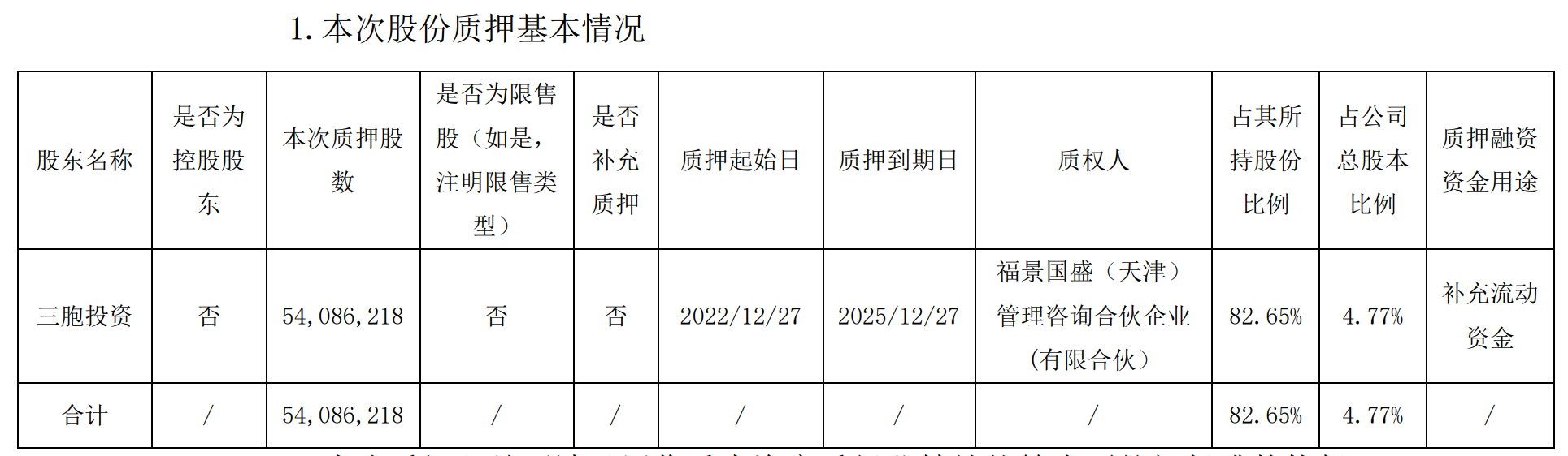 王府井于2022年12月29日收到股东三胞投资发来的通知,其将所持有的公司股份解除质押后再质押:其中解除质押65,436,218股,占总股本5.77%;质押54,086,218股,占总股本4.77%。
