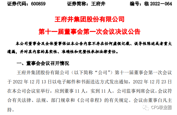 另据12月23日晚间王府井发布的《第十一届董事会第一次会议决议公告》,会议通过关于选举董事长、副董事长的议案,选举白凡为该公司第十一届董事会董事长。