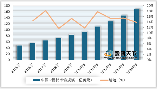 从公开数据显示,中国的IP授权市场规模增速自2015-2019年保持两位数增长,高于全球的授权市场规模增速。2015-2019年中国IP授权市场规模的复合增速约14.9%,2019-2024年预计中国IP授权市场规模的复合增速约为14.8%。